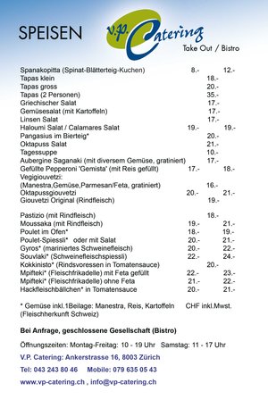 Für jedes Fest und jeden Anlass, sind ihre schmackhaften Kostbarkeiten auch weiterhin als Catering und Party Service bestellbar. Täglich frische Tagesspezialitäten für den Genuss des original griechischen Geschmack. Eine Oase für Liebhaber der griechischen Küche mit kleinen Häppchen (Mesedes).